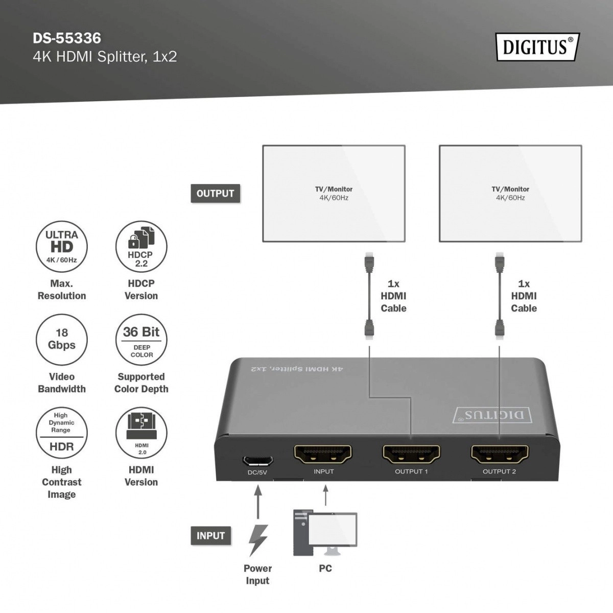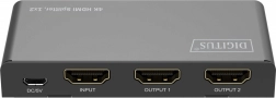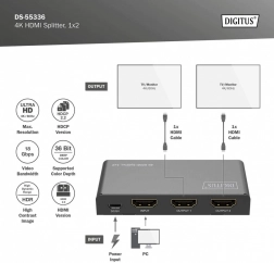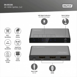 HDMI elosztó DIGITUS lehetővé teszi, hogy az HDMI eszközökről származó audio- és videoszignálokat két televízióra, monitorra vagy projektorra osszuk el UHD 4K / 60 Hz minőségben. Támogatja az intelligens EDID kezelést három üzemmód közötti választási lehetőséggel, és megkönnyíti a csatlakoztatott kijelzők automatikus észlelését.