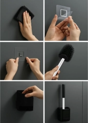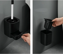Elegáns és higiénikus megoldás a fürdőszobába: a RUHHY WC-kefe fekete állvánnyal és félíves fejjel, rugalmas tüskékkel hatékony tisztítást biztosít az ülőke pereme alatt is karcolások nélkül. Fröccsenés és vízfelvétel nélkül a tisztább WC-környezetért. Fúrásmentes szerelés a falra öntapadó tartóval, vagy szabadon álló elhelyezés.