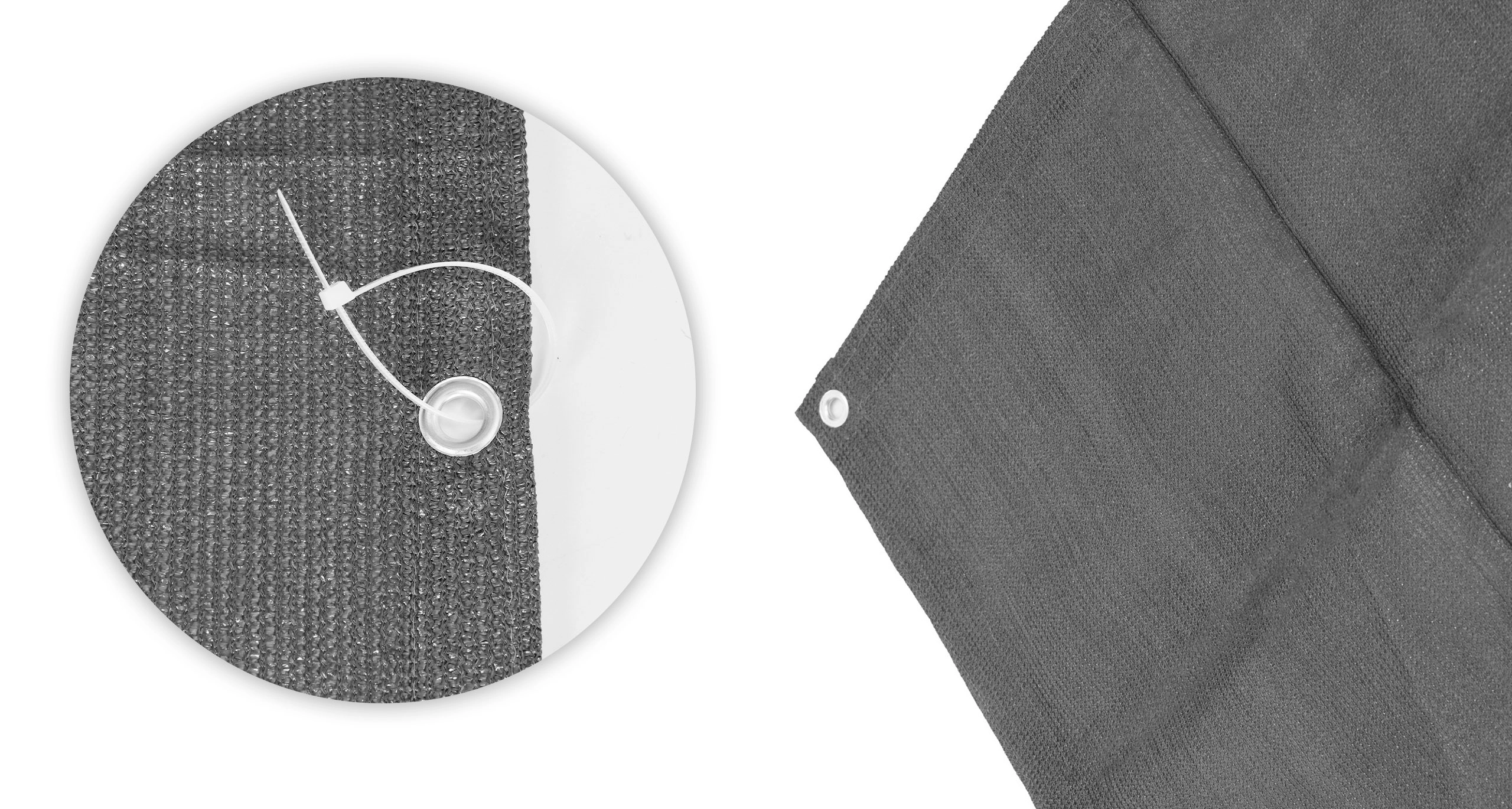 A csomag tartalmazza az alumínium ringliket, amelyek körülbelül 40 cm-enként helyezkednek el a szélek mentén, stabil és tartós rögzítést biztosítva a korláton. A rozsdamentesség révén a termék funkcionális és esztétikus marad hosszú távú kültéri használat után is. A szerelőkészlet tartalmaz 26 húzózárat és 2 nyolc méteres zsinórt a korlát mindkét oldalára történő gyors telepítéshez. A rugalmas szerkezet lehetővé teszi a különböző erkélyekre és teraszokra való könnyű alkalmazkodást.