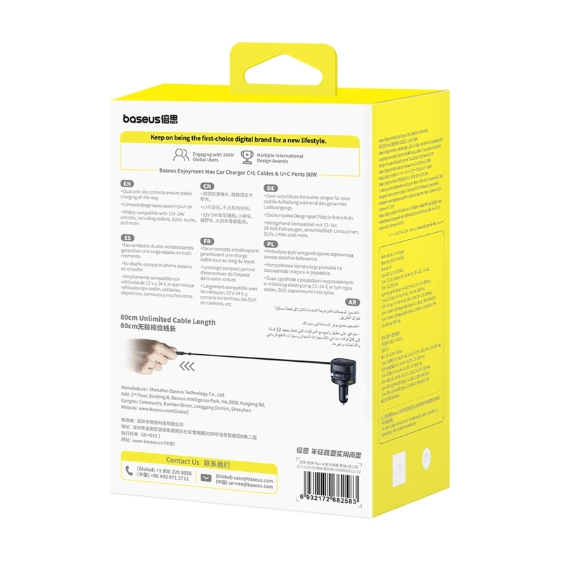 A Baseus autós töltő lehetőséget kínál négy eszköz egyidejű töltésére, két beépített kábellel (USB-C és Lightning) és további két porttal (USB-C és USB-A).