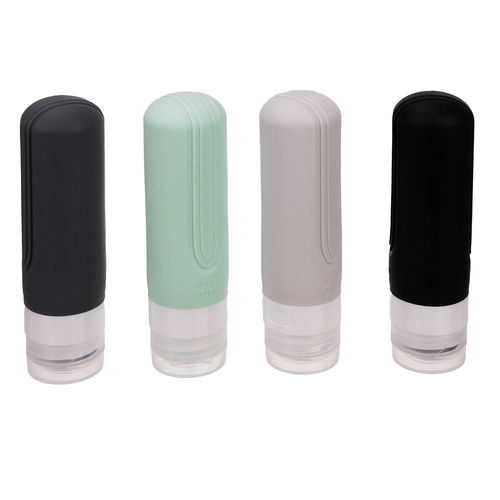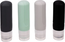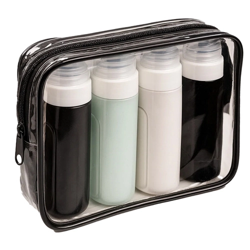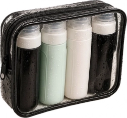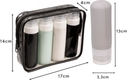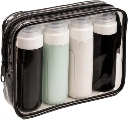 Utazó kozmetikai szett négy rugalmas üvegcsével, amelyek megfelelnek a repülőtéri követelményeknek, vízállóak és ideálisak repülőgépre. Kényelmet és szervezettséget biztosít az utazások során.