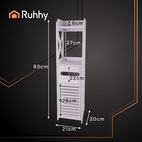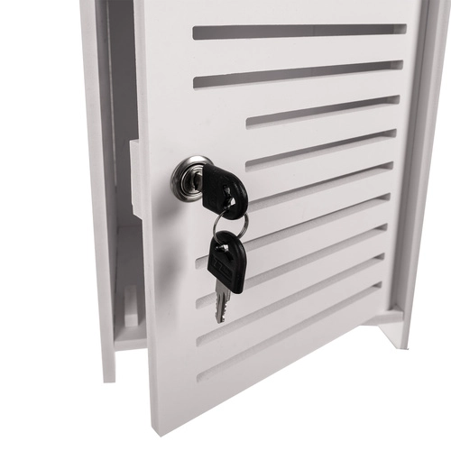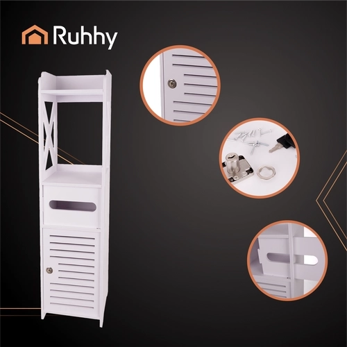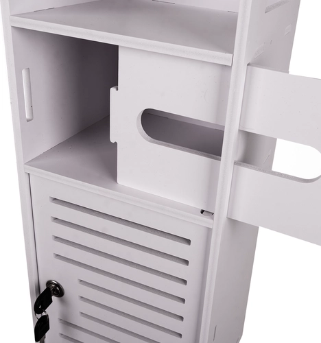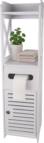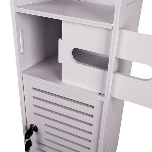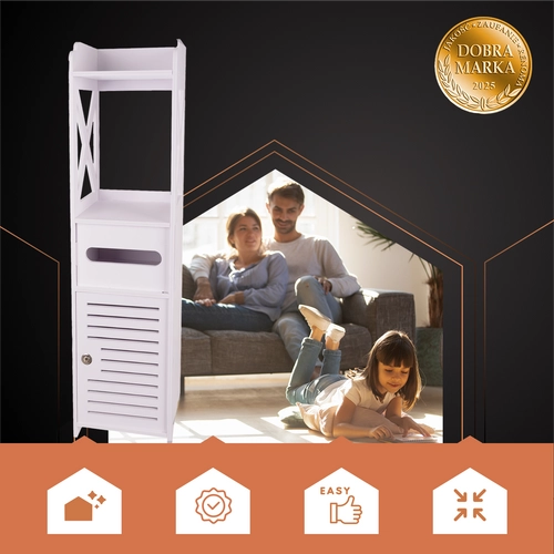 A fehér színű álló fürdőszobai szekrény praktikus megoldás a kozmetikai termékek és tisztítószerek tárolására. A kulcsos zár gyermekek elől védi a tartalmat, és esztétikus dizájnnal rendelkezik, ami illik minden fürdőszobához.