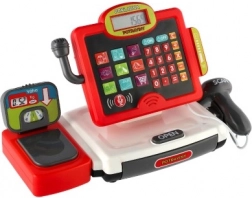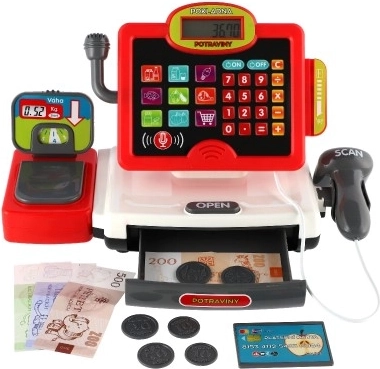 Szórakoztató és oktató jellegű gyerek elektronikus pénztárgép kiegészítőkkel a kis kereskedőknek. Tartalmaz fény- és hangeffektes leolvasót, bankjegy- és érmeutánzatokat, hitelkártya-nyílást, működő számológépet és mérleget gyümölcshöz és zöldséghez. Ideális játék a képzelet és az alapvető számolási készségek fejlesztéséhez.