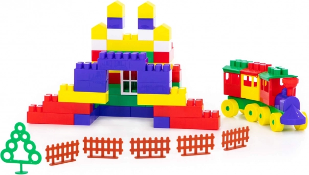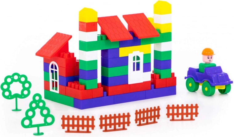 Különböző formákat tartalmaz, mint házak, fák és kerítések, amelyeket a gyerekek saját fantáziájuk szerint rakhatnak össze.