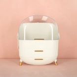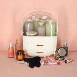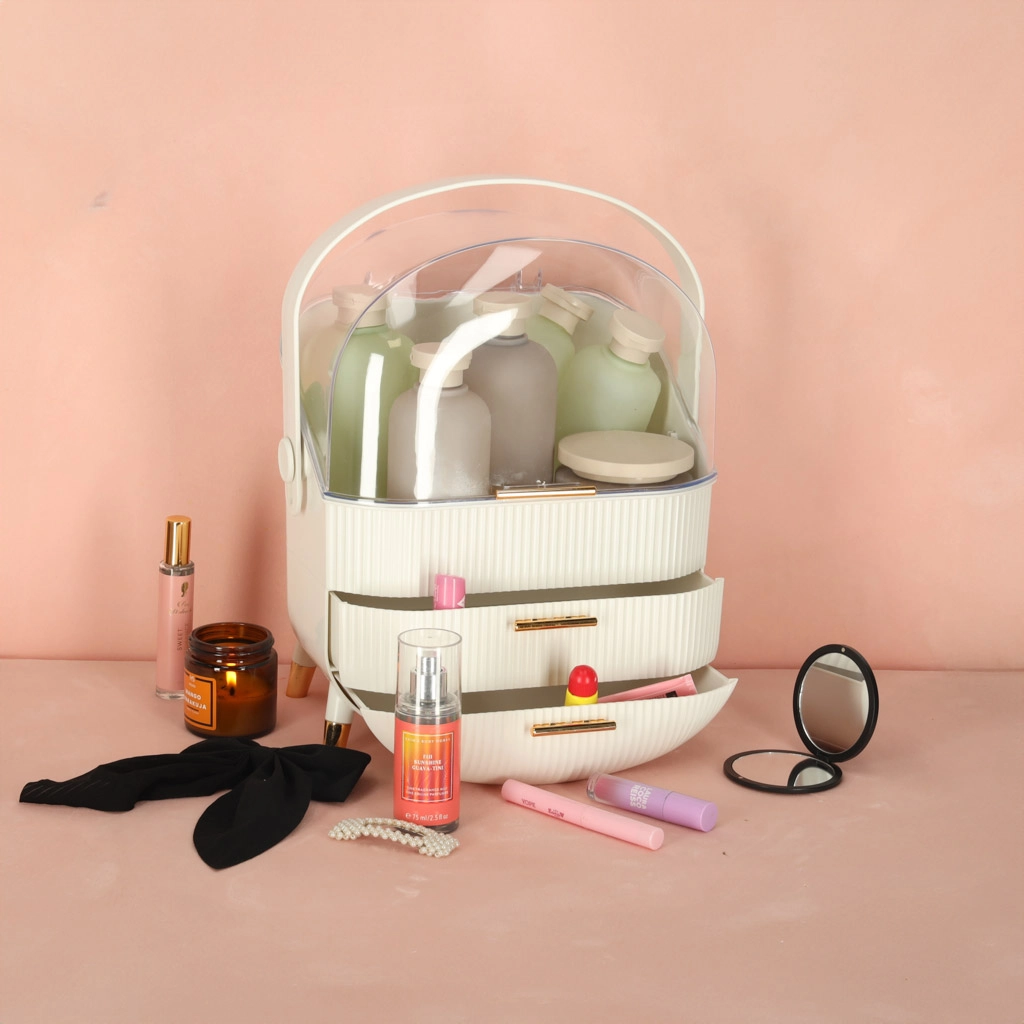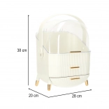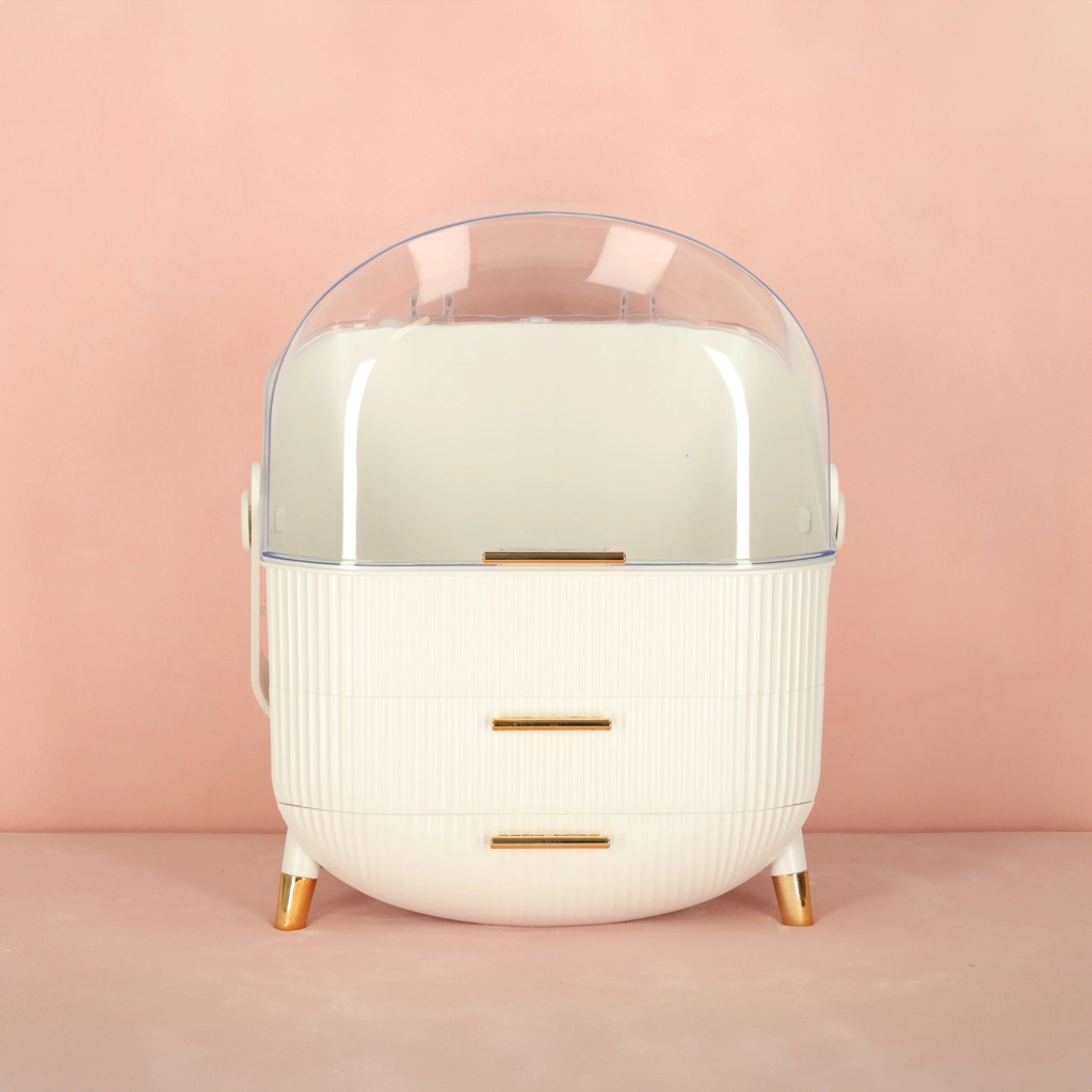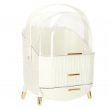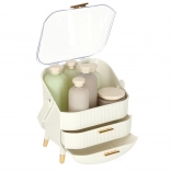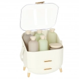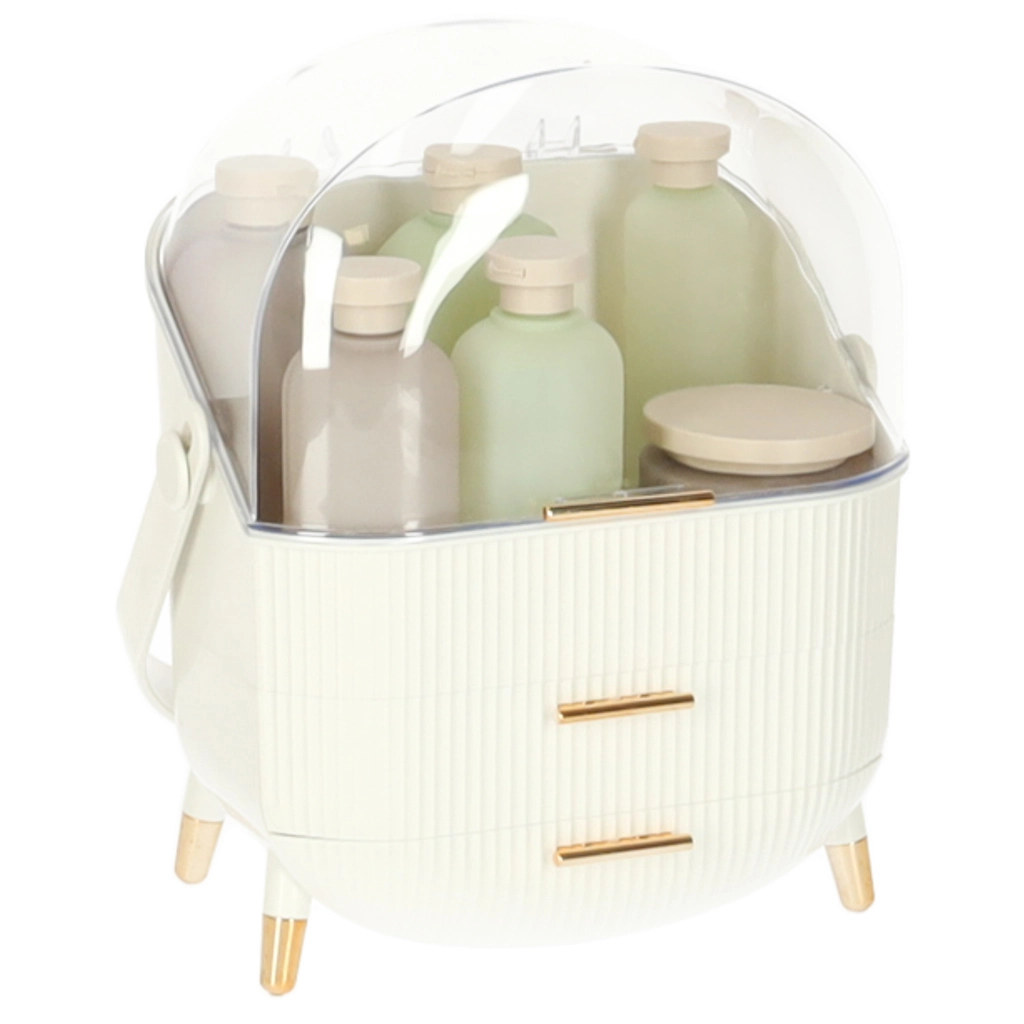 Bemutatjuk a fehér kozmetikai rendezőt fiókokkal, amely segít rendet tartani a kozmetikai termékei és ékszerei között. Ez a rendező két tágas fiókkal és áttetsző fedéllel van felszerelve, amely védi a dolgait a portól, és közben szépen kiállítja azokat. Az elegáns forma arany részletekkel luxus megjelenést kölcsönöz minden fürdőszobának vagy toalettasztalnak.