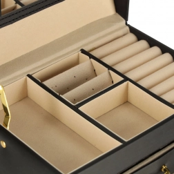 Az átgondolt tagolás gyűrűhengereket, apróságoknak való rekeszeket és 2 kihúzható fiókot tartalmaz elválasztókkal láncokhoz, karkötőkhöz és fülbevalókhoz. A kulcsos zár és a megbízható patentzár biztonságos tárolást garantál az értékek számára.