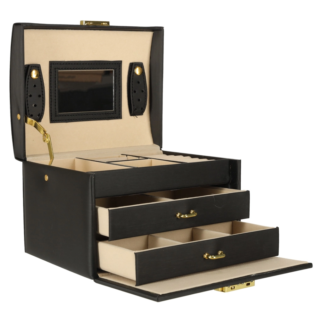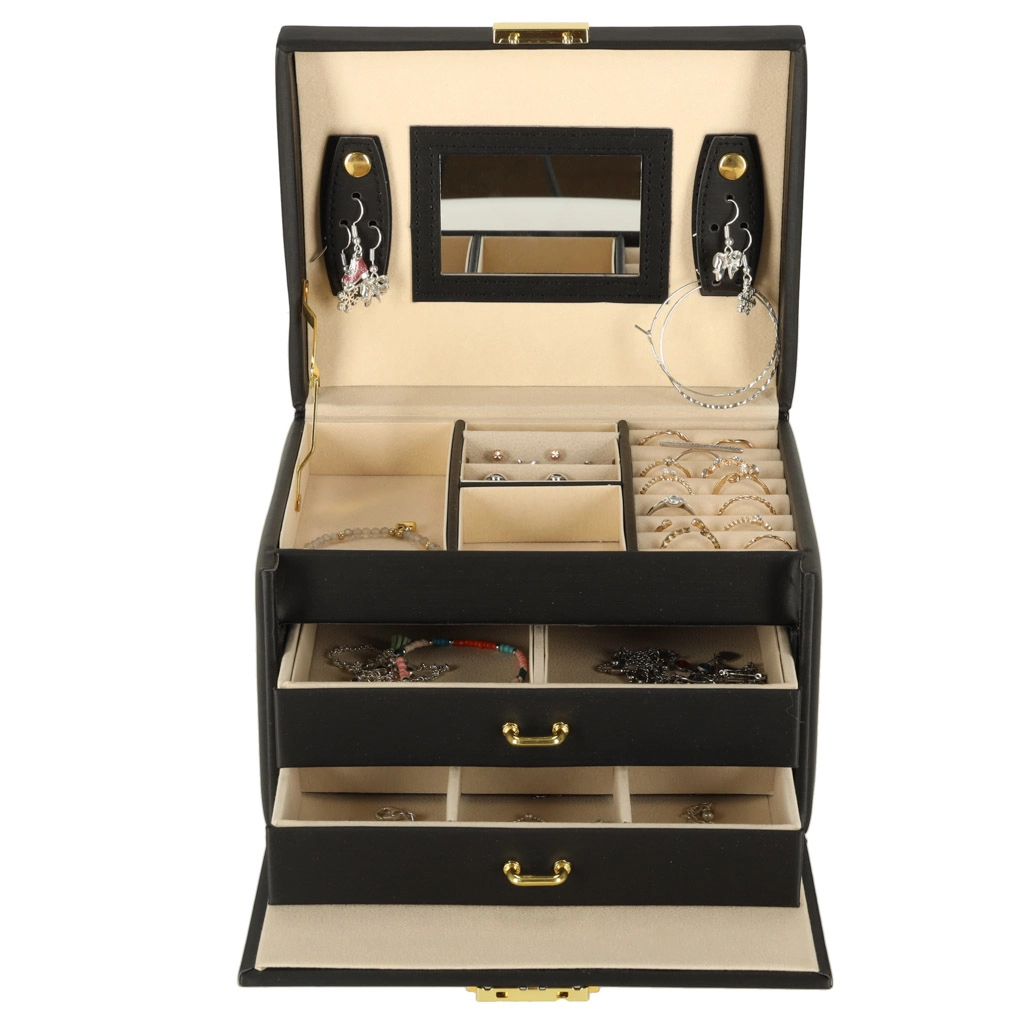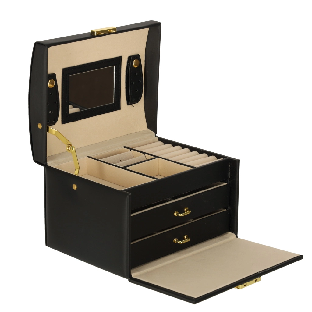 Elegáns fekete ékszerdoboz tükörrel és fiókokkal a gyűrűk, fülbevalók, karkötők és nyakláncok áttekinthető tárolásához. Kínál tágas rekeszeket, két fiókot, puha bélést a karcolások ellen és kulccsal zárható rendszert a nagyobb biztonságért. Ideális megoldás rendezett ékszertároláshoz otthon és utazáshoz.