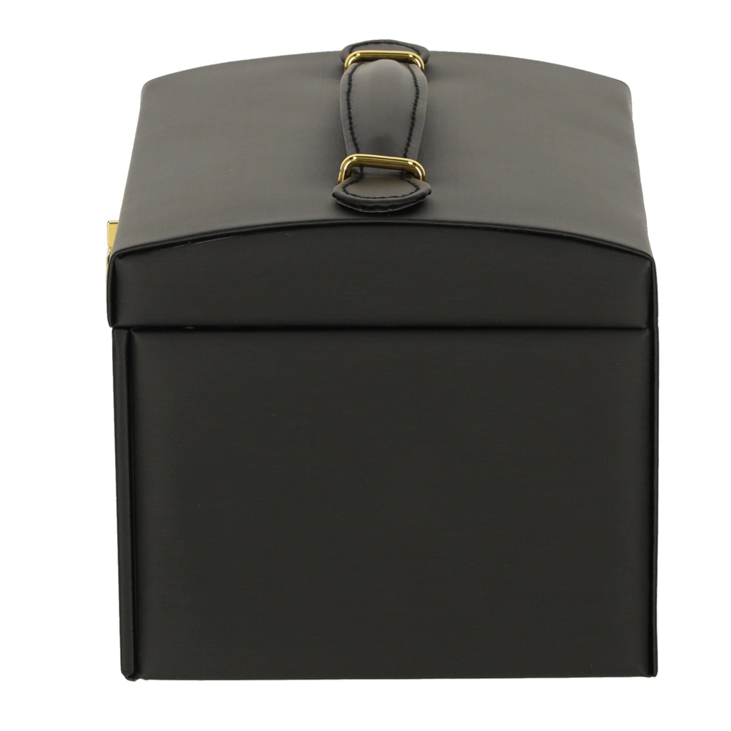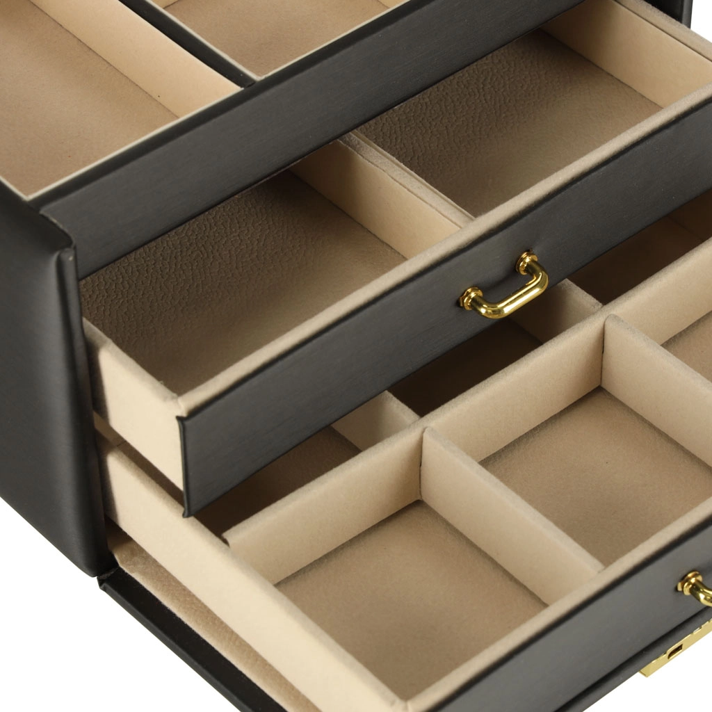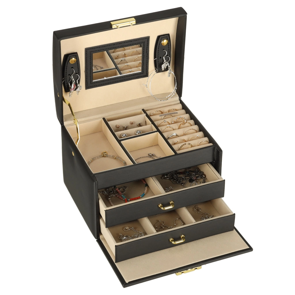 Elegáns fekete ékszerdoboz tükörrel és fiókokkal a gyűrűk, fülbevalók, karkötők és nyakláncok áttekinthető tárolásához. Kínál tágas rekeszeket, két fiókot, puha bélést a karcolások ellen és kulccsal zárható rendszert a nagyobb biztonságért. Ideális megoldás rendezett ékszertároláshoz otthon és utazáshoz.