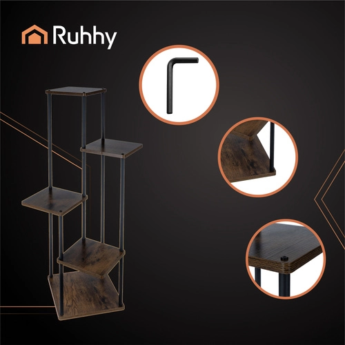 A RUHHY virágtartó állvány funkcionalitást és stílust hoz otthonába. Az 5 szintes kialakításnak köszönhetően kis területen biztosít helyet a növényeknek modern dizájnnal, amely fémkeretet és fa polcokat tartalmaz. A szilárd fémváz akár 75 kg terhelést is elbír, garantálva az állvány stabilitását és tartósságát. A padló biztonsága érdekében védelmi talpakkal van ellátva, amelyek megelőzik a karcolásokat és lehetővé teszik az állvány kiegyenlítését.