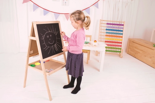 Ez a multifunkcionális mágneses tábla gyerekeknek egyik oldalán szárazon törölhetõ filc felületet, másik oldalán hagyományos krétás táblát kínál. A táblák között egy rúd található, amelyre papírfithet rögzíthető.
