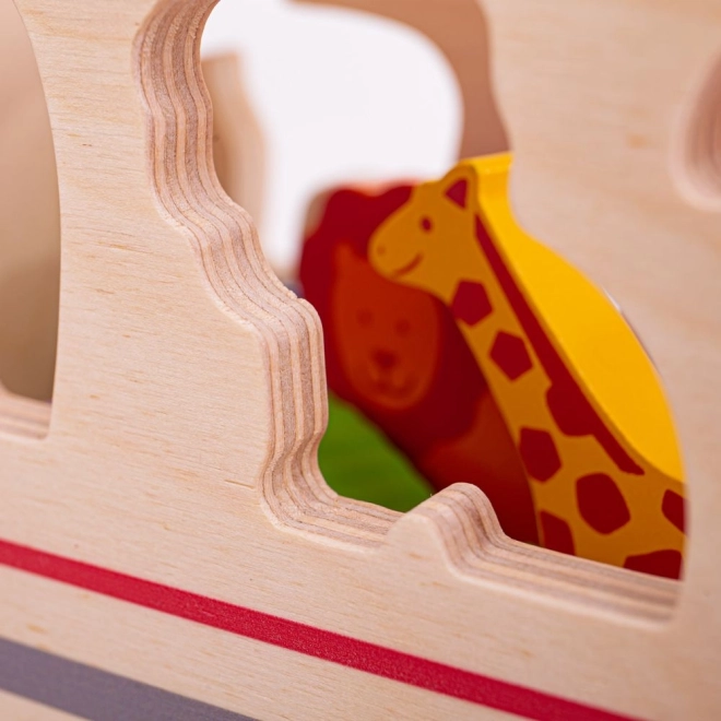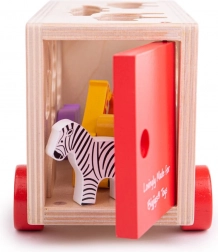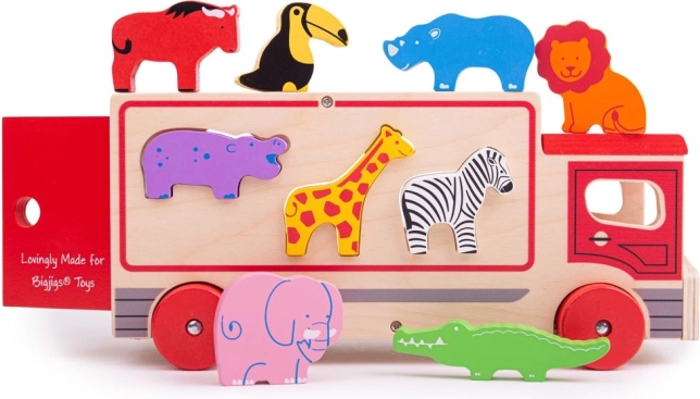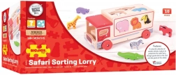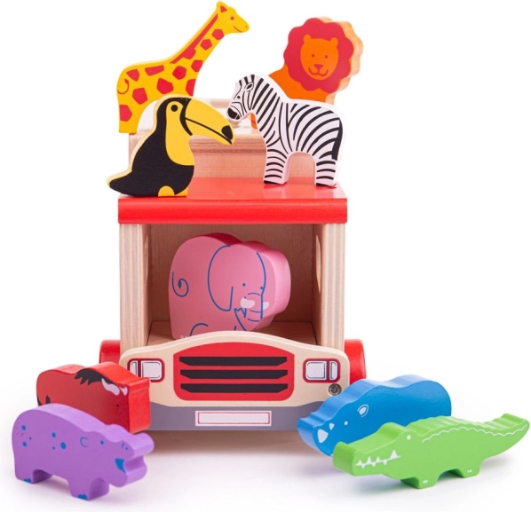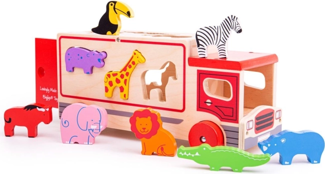 Ez a színes fa játék felismerhető állatokat tartalmaz, amelyek speciális nyílások segítségével helyezhetők el a teherautón a jármű tetején és oldalán. A gyerekek válogathatnak formákat és tanulhatnak különböző állatokról, majd az egyes állatokat a megfelelő nyílásba helyezhetik. Miután minden állat a helyén van, a teherautó hátsó ajtaja bezáródik, és új kalandra indulhat.