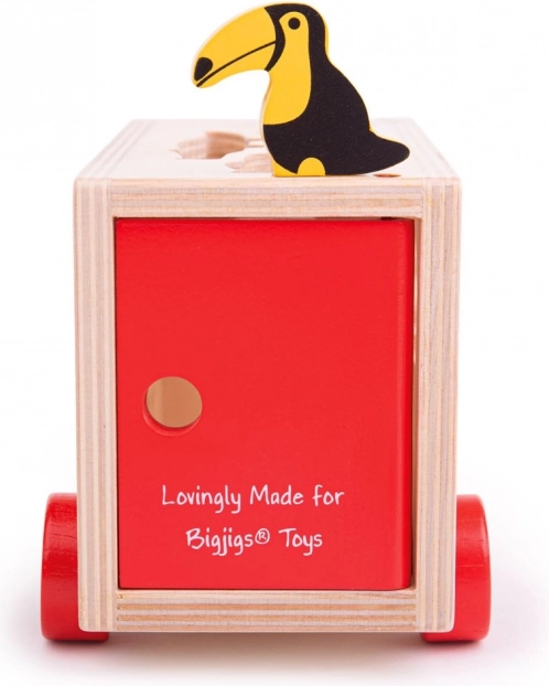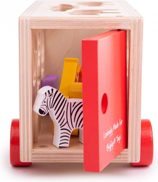 A fa teherautó formaválogatóként működik, így a gyerekek fejleszthetik képességeiket a formák felismerése során.