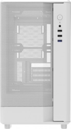 Funkcionális dizájn: A hálós elülső panel porfilterrel javítja a légáramlást és minimalizálja a por lerakódását. A bal oldali edzett üvegpanel betekintést nyújt a ház belsejébe.
