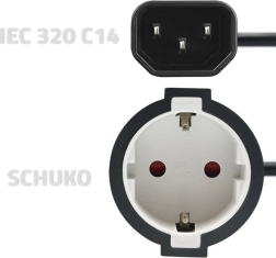 Felhasználás: IEC 320 C14 kimenet (pl. UPS, PDU vagy tápegység) összekapcsolása SCHUKO dugós fogyasztókkal. A rövid kábel csökkenti a csatlakozók terhelését és segít rendet tartani a rackben.
