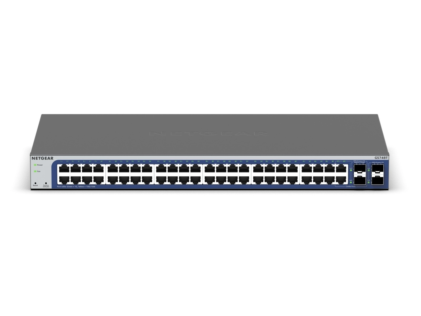 Intelligens NETGEAR GS748T kapcsoló fejlett L2 és L3 funkciókat kínál, magas teljesítménnyel és felhasználóbarátsággal. Lehetővé teszi a távoli kezelést az Insight Cloud Managementen keresztül.