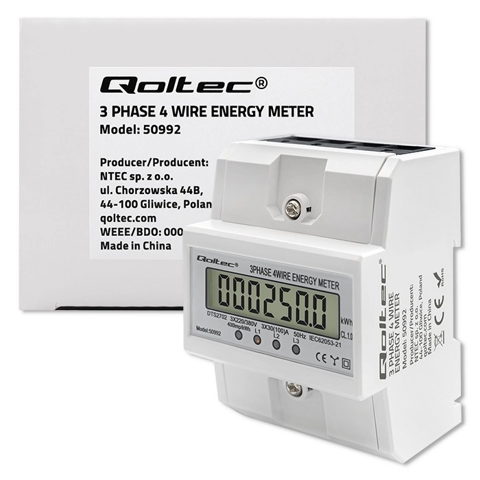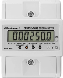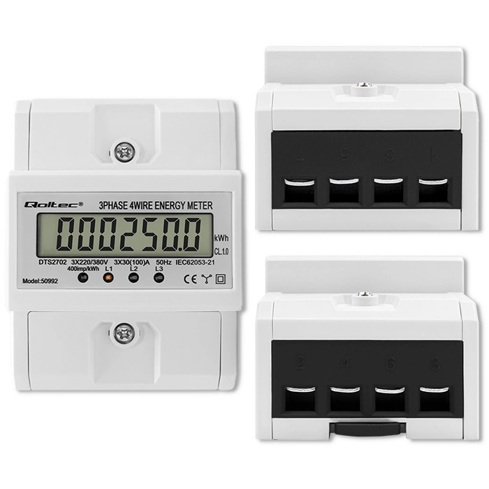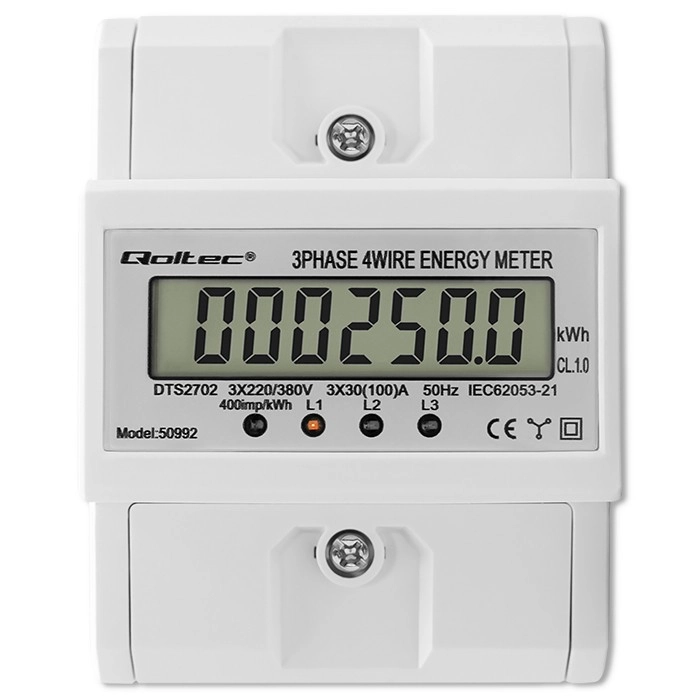 Ez az elektronikus fogyasztásmérő precíz monitorozást tesz lehetővé háromfázisú elektromos rendszerekben 230V/400V feszültségnél, 50Hz frekvencián. A LED jelző jelzi a fogyasztás folyamatát, míg az LCD kijelző megjeleníti a fogyasztott energia adatait. A mérés 400 impulzus/kWh frekvencia impulzusai alapján történik.