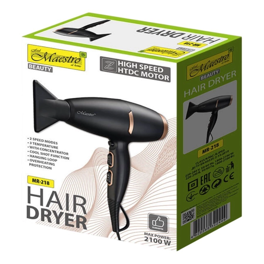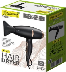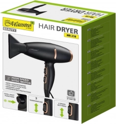 A Maestro hajszárító két fúvócsővel van felszerelve a pontos formázás és a légáram irányítás érdekében, pont oda, ahol a legnagyobb szükség van rá. Két fújási sebességet és három hőmérséklet beállítást kínál, lehetővé téve a működés személyre szabását az egyéni igények és hajtípus szerint.