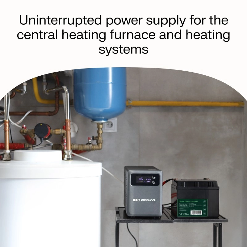 GreenCell UPS lehetővé teszi külső akkumulátor csatlakoztatását, így a kapacitást igény szerint állíthatja, és biztosítja a szükséges időt a vészhelyzeti áramellátásra. Az eszköz masszív fém burkolatban található, ami alkalmassá teszi háztartási és technikai felhasználásra egyaránt. A tiszta szinuszhullámnak köszönhetően táplálhatók vele kazánok, hűtőszekrények, hőszivattyúk és technikai eszközök is.
