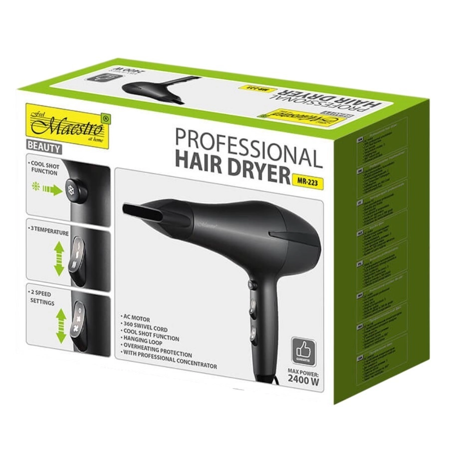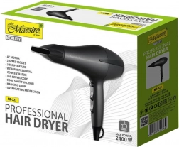 Maestro 2400W hajszárító úgy lett tervezve, hogy kielégítse mindennapi hajápolási igényeit. Ezzel a készülékkel erős és stabil légáramot kap, amely bármilyen hosszúságú és sűrűségű hajat kezel.