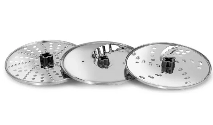 A csomag része 3 rozsdamentes acéllemez. A burgonya pürésítő lemez megkönnyíti a ropogós lepények elkészítését, a reszelő és szeletelő lemez ideális zöldségekre és sajtokra, míg a rudak vágására szolgáló lemez gyorsan létrehozza a kívánt formájú sült krumplikat vagy köretek készítését salátákhoz.
