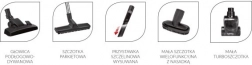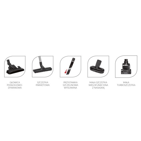A porszívó felszerelése: A készlet tartalmazza a padlós és szőnyeges fejeket, parkettakefét, kis turbó kefét, kihúzható résnyílást és egy kis multifunkcionális kefét tartozékkal.