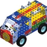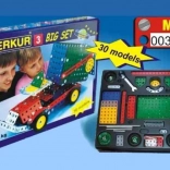 Bemutatjuk a Merkur 3 építőkészletet, amely ideális a kis mérnökök és szüleik számára. Ez a klasszikus egyrétegű készlet 273 darabot tartalmaz, beleértve szalagokat, íveket, szögeket, kerekeket és gumikat. A csomag tartalmaz csavarokat és anyákat is, amelyek szükségesek a széles körű modellek összeszereléséhez.