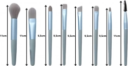 Minden ecsetnek átgondolt formája és mérete van konkrét feladathoz: a szemhéjpúderek felvitelétől és eldolgozásától kezdve a korrekción át egészen a precíz vonalak megrajzolásáig és a szemöldök formázásáig. A készlet színkeverékben érkezik (rózsaszín, kék, szürke), választható szín nélkül.