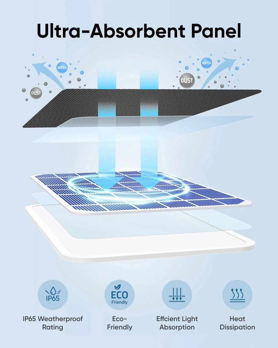 A magas teljesítményű 3W-os panel biztosítja, hogy napi néhány órányi közvetlen napsütés mellett kamerája egész nap teljesen feltöltve maradjon. Az egyszerű telepítésnek köszönhetően a panel bárhová elhelyezhető, ahol elegendő napfény van. A 360°-os forgatható tartó és a függesztett csavarok egyszerű elhelyezést és beállítást tesznek lehetővé.