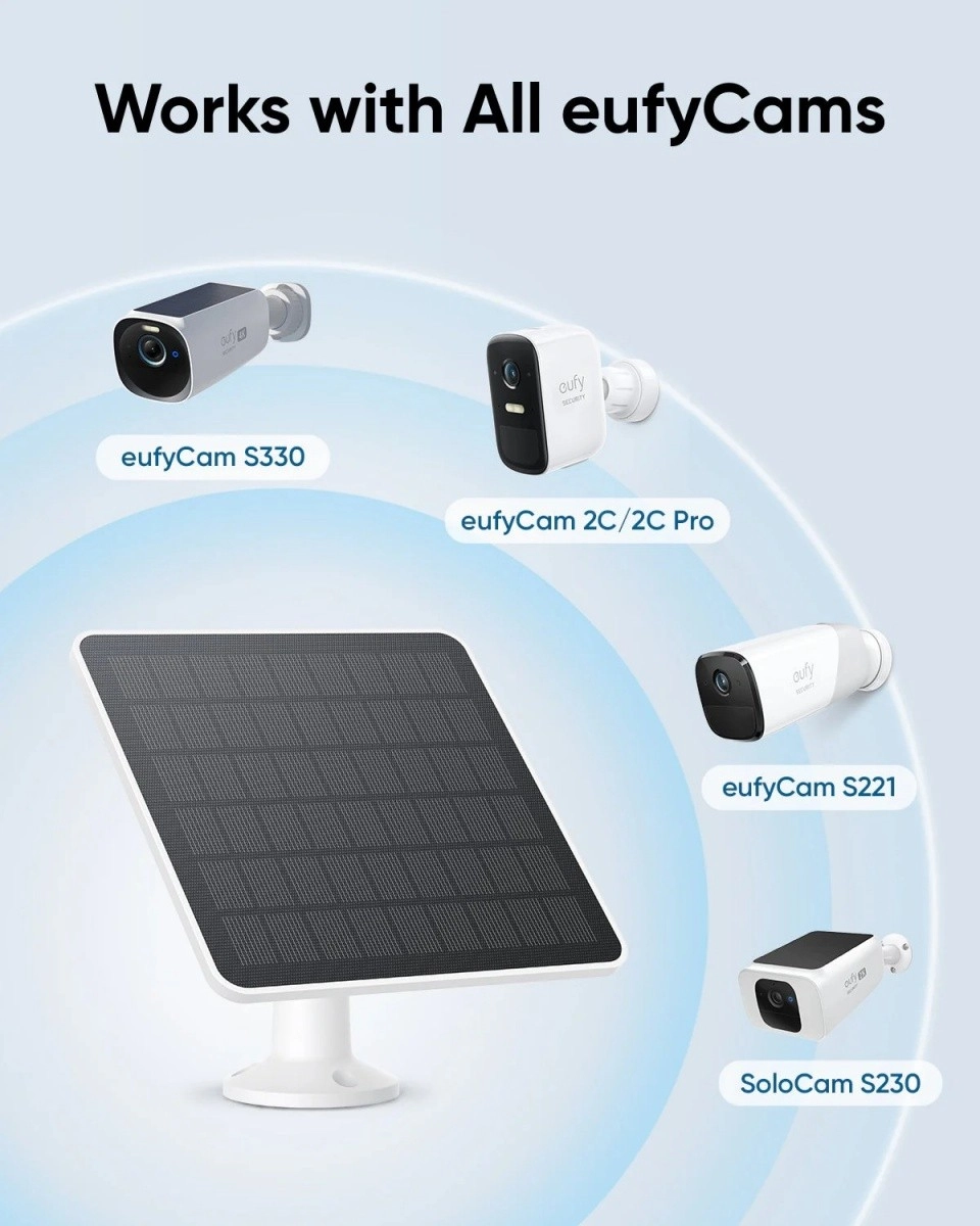 Élvezze a kompatibilitást minden EufyCam kamerával, ami azt jelenti, hogy a napelem áramellátást tud nyújtani az olyan modellekhez, mint a EufyCam 2, EufyCam 2 Pro, EufyCam 2C, EufyCam 2C Pro, EufyCam S330 és SoloCam S230.