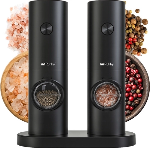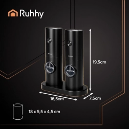 RUHHY elektromos bors- és sóőrlők ideális kiegészítők mindazok számára, akik nagyra értékelik a minőséget és az esztétikát. Univerzális használat lehetővé teszi, hogy különböző típusú fűszerekhez használják, beleértve a gyógynövényeket is. Az őrlést kerámia mechanizmus biztosítja, amely tartós és precíz, fémes utóíz nélkül.