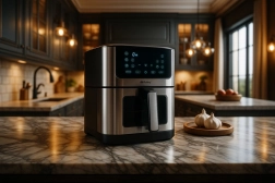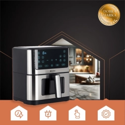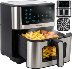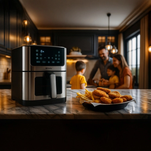 A Ruhhy fritőz biztonságos zsíradék nélküli sütést kínál, lehetővé téve a kedvenc ételek egészségesebb elkészítését anélkül, hogy az változtatna az ízükön. Tapadásmentes felülete könnyíti a tisztítást, és modern formatervezése tökéletes összhangot biztosít a konyhával.