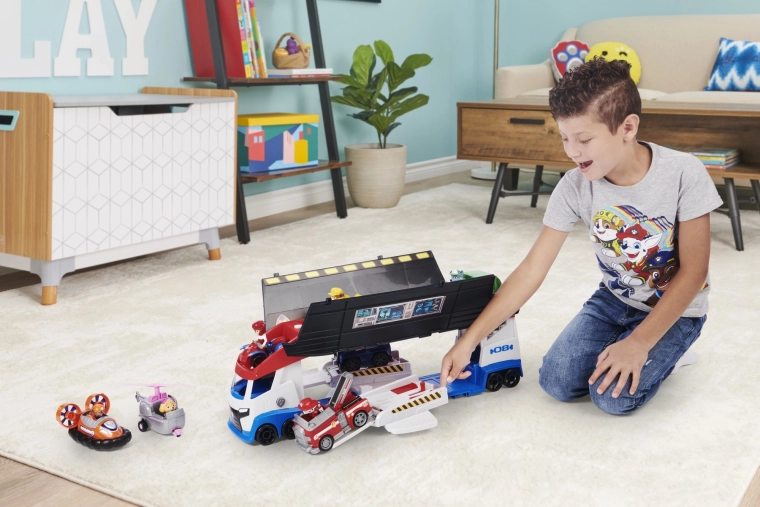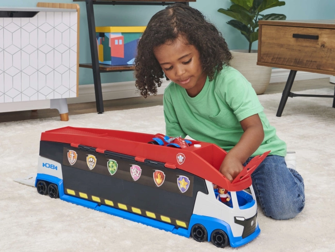 A népszerű PAW PATROL sorozat által ihletett óriás szállító minden kis mentőst megörvendeztet. A lehajtható oldalpaneleknek és rámpáknak köszönhetően a kamionból mobil szerviz és irányítóközpont lesz. A mancsos logóval ellátott gomb megnyomására valósághű motor-, duda- és tolatáshangok szólalnak meg, tovább fokozva a játék hangulatát.