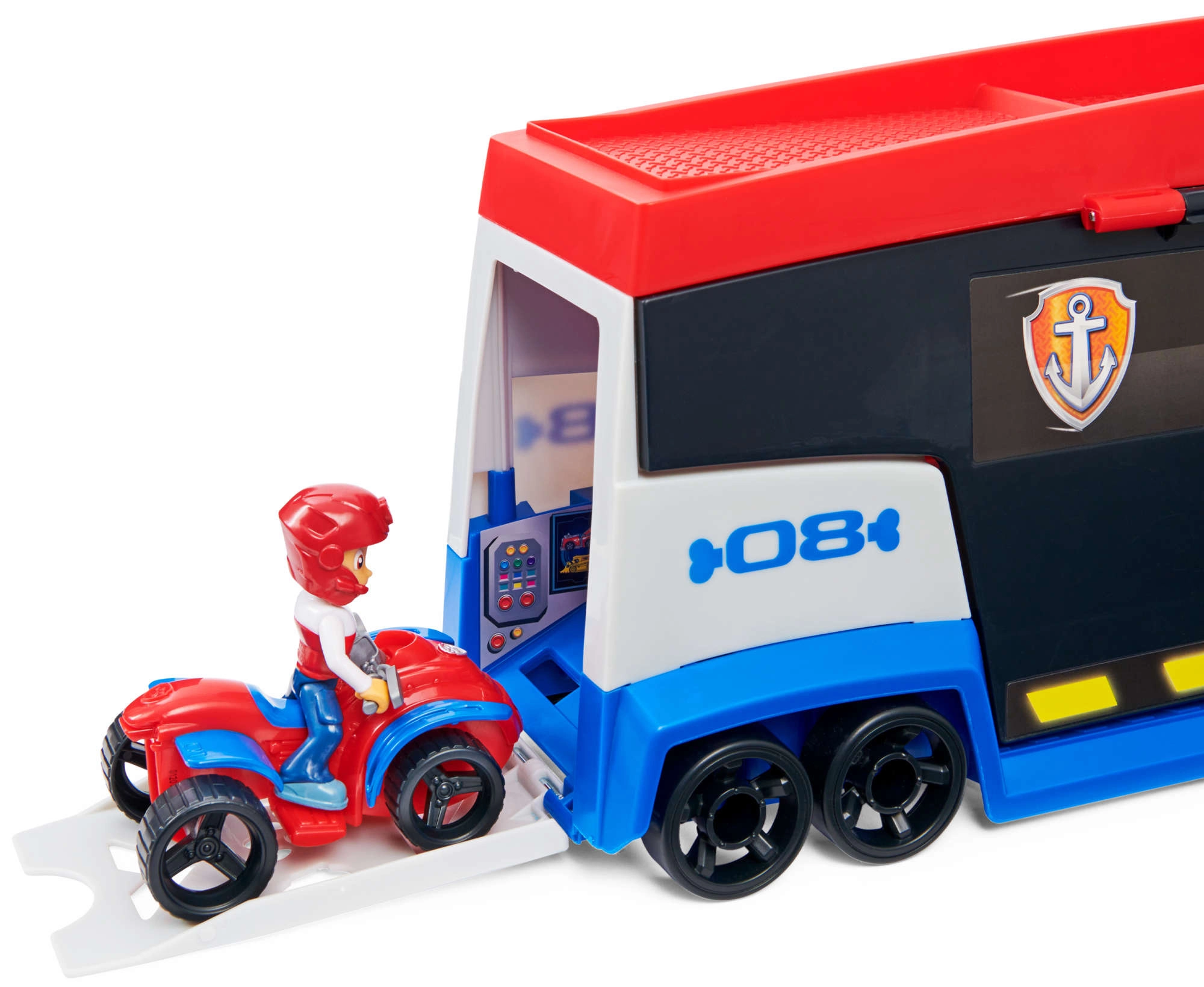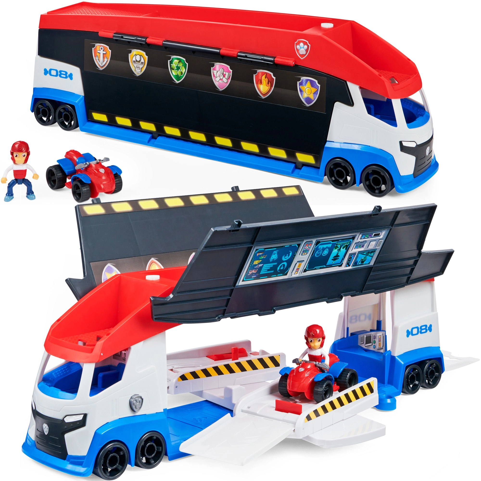A járőr könnyedén akár 6 járművet szállít (kompatibilis a standard PAW PATROL autókkal), 2 kilövővel rendelkezik a gyors akciókezdéshez és felnyíló oldalsó ajtókkal a zökkenőmentes felhajtáshoz. A mellékelt Ryder figura és a quad segítségével a gyerekek azonnal bevetésre indulhatnak.