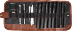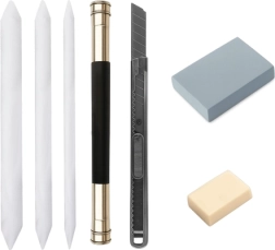 27 kézzel válogatott eszközt tartalmaz, beleértve a ceruzákat, szénceruzákat és más eszközöket, amelyek szükségesek a vázlatkészítéshez.