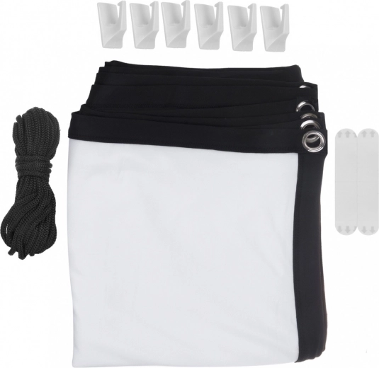 A fali rögzítés egyszerű a mellékelt horgoknak és ragasztószalagnak köszönhetően. A vászon könnyen eltávolítható és áthelyezhető más helyre. A csomag tartalmaz egy rögzítő kötelet is.