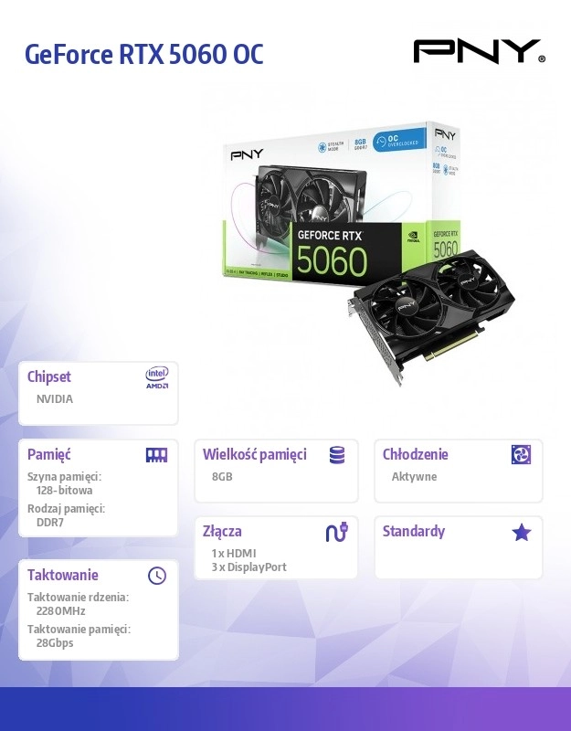 A PNY GeForce RTX 5060 grafikus kártya kivételes grafikus teljesítményt nyújt a játékosok és alkotók számára, ami átlépi a lehetőségek határait. Az NVIDIA Blackwell legújabb architektúrája és a DLSS 4 technológia révén lenyűgöző játékélményt nyújt lebilincselő grafikával és magas frissítési gyakorisággal.