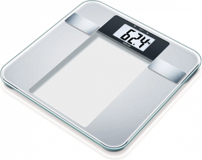 Diagnosztikai mérleg Beurer pontos méréseket biztosít a testsúly, testzsír- és víztartalom, izomtömeg, valamint a BMI kiszámítása terén nagy LCD kijelzővel és 150 kg teherbírással.