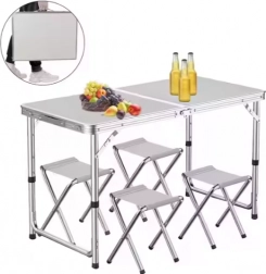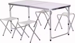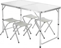 A szett könnyű, mégis erős asztalt és négy kényelmes széket tartalmaz, amelyek alkalmasak táborozásra, nyaralókban, kertekben, erkélyeken vagy teraszokon való használatra. A modern dizájn fehér asztallappal és ezüst alumínium vázzal tökéletesen illeszkedik bármely környezetbe, a természettől a szervezett otthoni helyekig. A szett nemcsak megkönnyíti a szabadtéri pihenés szervezését, hanem helyet is takarít meg – összecsukás után könnyen tárolható szekrényben, garázsban vagy ágy alatt.