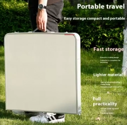 Az asztal és a székek összecsukható szerkezete kompakt tárolást tesz lehetővé egy praktikus fogantyús bőröndként, ami megkönnyíti a hordozást és a tárolást. Különösen praktikus kirándulások során, amikor minden centiméternyi hely számít a csomagtérben.