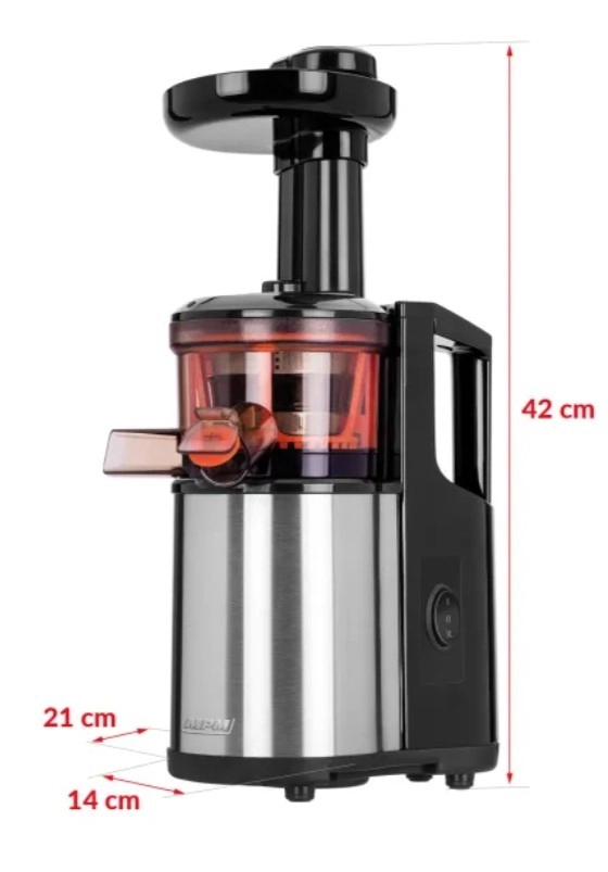 A Lassú Forgású Gyümölcsprés egy literes tartállyal és 800 ml-es péptartállyal van felszerelve, ami lehetővé teszi a hosszú üzemidőt a tartályok gyakori kiürítése és mosása nélkül. A készülék csendes üzemelése lehetővé teszi bármely napszakban való használatát anélkül, hogy zavarná a háztartás többi tagját. Rendelkezik továbbá REVERSE funkcióval, amely lehetővé teszi a motor fordított irányú működését. Ezt a funkciót különösen a citrusfélék préselésénél használd, ahol a membránok és rostok elzárhatják a szűrő nyílásait.