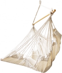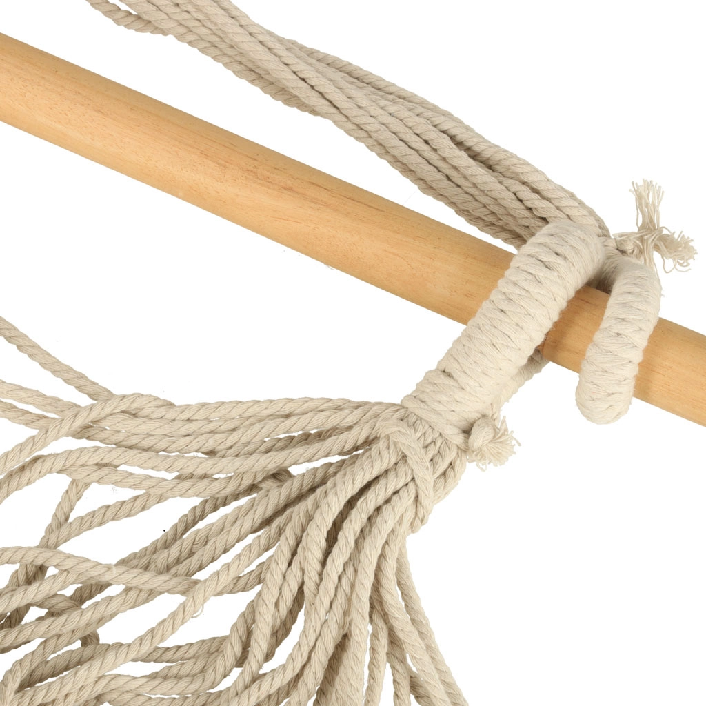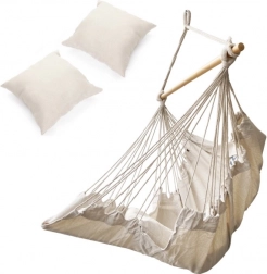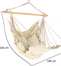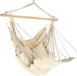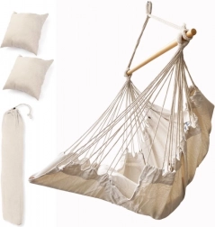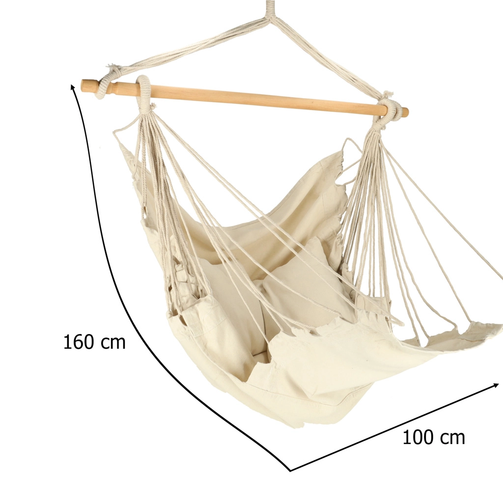 Ez a függő bútordarab illik a boho dizájnhoz, és elhelyezhető akár kertben, akár nyaralóban. Anyaga kellemes tapintású és segít a stresszoldásban. A csomag tartalmazza a széket, a fa rudat, a függesztő zsinórokat és két kényelmes párnát. Tegyen egy darabka nyugalmat és kényelmet az életébe.