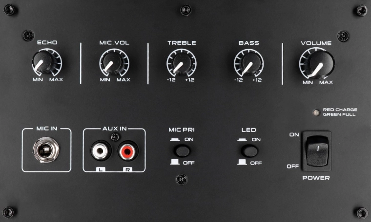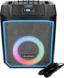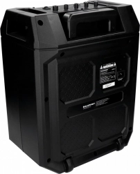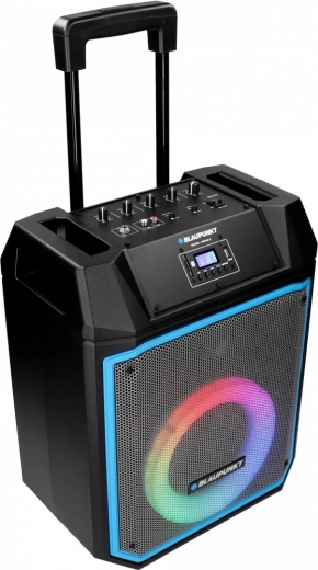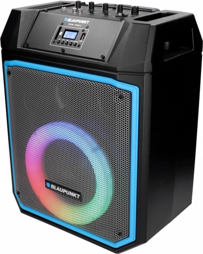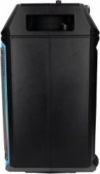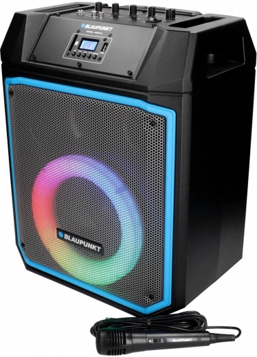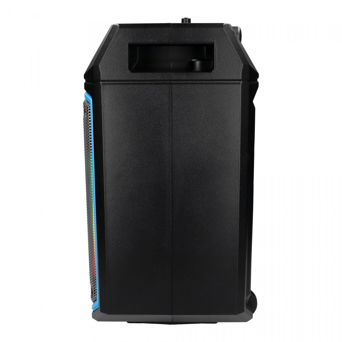 Kényelmet biztosít a távirányító és a teleszkópos fogantyúk kerekekkel a könnyű mozgatáshoz. A beépített mikrofon karaoke-hez és a több színű LED panel a parti hangulatához hozzáad.