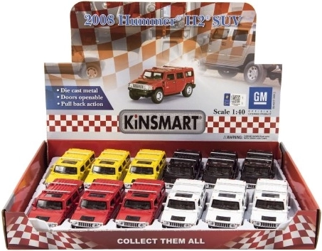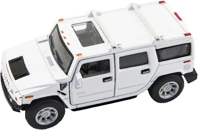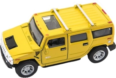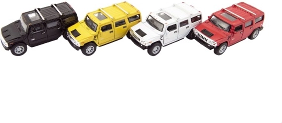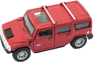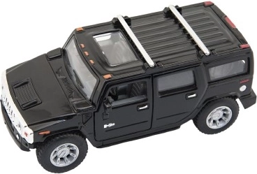 Stílusos terepjáró modell, a Hummer H2 a Kinsmart márkától, amely örömet szerez gyerekeknek és gyűjtőknek egyaránt. Fém és műanyag elemeket kombinál, visszahúzós meghajtással rendelkezik, sok változatnál nyitható ajtókkal és 12 cm hosszúsággal. 4 színváltozatban érhető el, és 3 éves kortól ajánlott.
