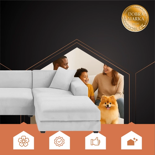 RUHHY márkájú huzat világosszürke rugalmas velúrból készült, tökéletes választás a sarokkanapé védelméhez és felfrissítéséhez. Alkalmazkodik a bútor formájához, nem mozdul el, és közben otthonos és elegáns megjelenést kölcsönöz a belső térnek. Az 190 - 230 cm univerzális méret a legtöbb standard sarokkanapéra illik.