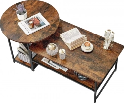 A kerek asztal becsúsztatási lehetősége gyors alkalmazkodást tesz lehetővé a tér aktuális igényeihez - önálló asztalként vagy a szett részeként is használható. Mindkét asztal további polcokkal rendelkezik újságok, könyvek, távirányítók vagy dekorációk tárolására. Ez a szett tökéletes választás loft, ipari, de modern és klasszikus elrendezésekhez is.