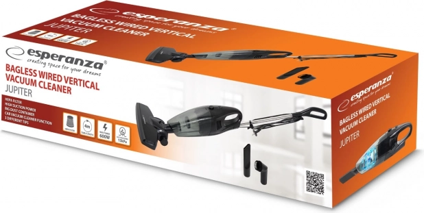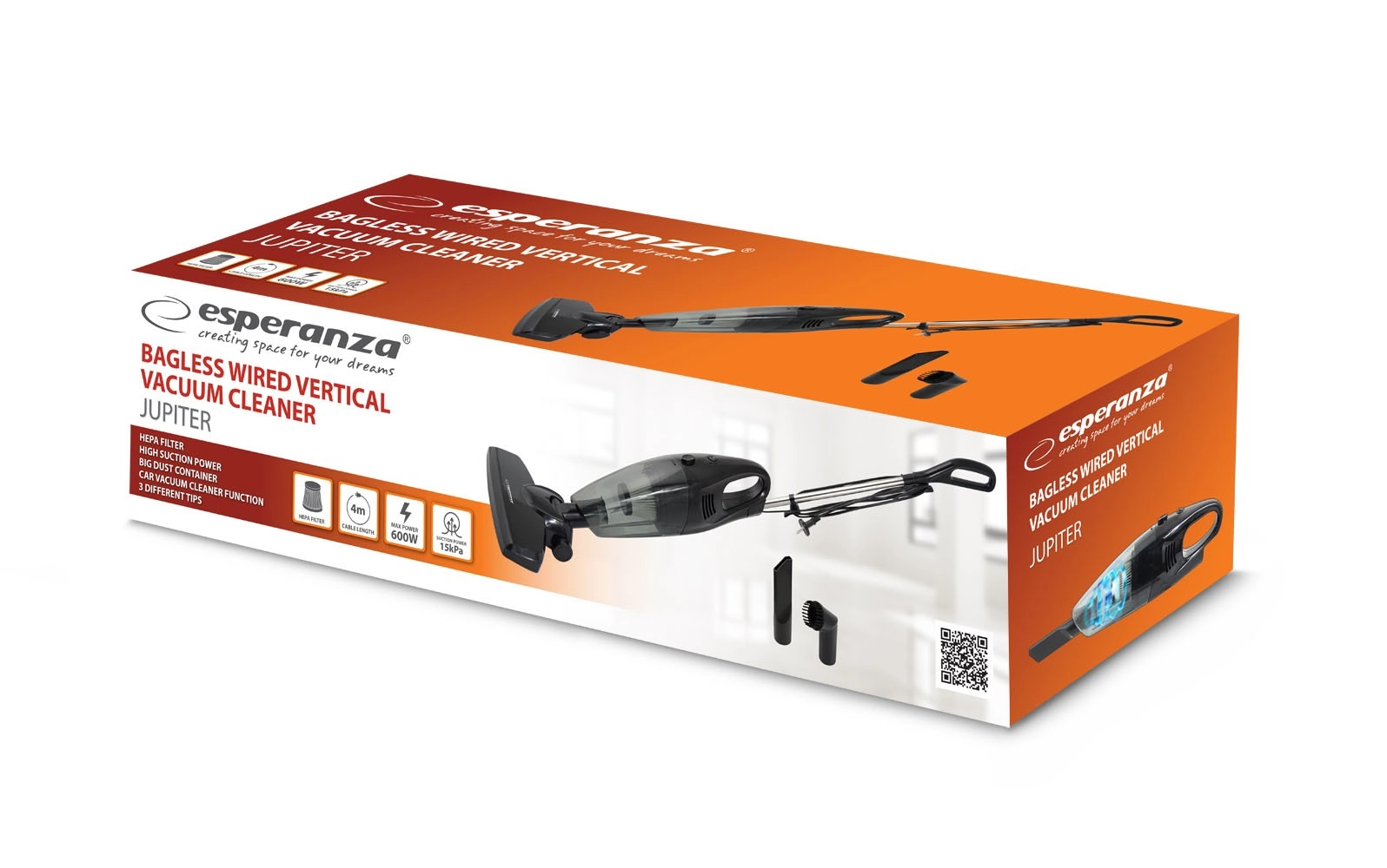 Esperanza Jupiter egy modern, kábeles álló porszívó, amelyet minden típusú padló gyors és hatékony tisztítására terveztek. Könnyű kialakítása, kényelmes fogása és cserélhető HEPA szűrője miatt ideális a mindennapi használatra.
