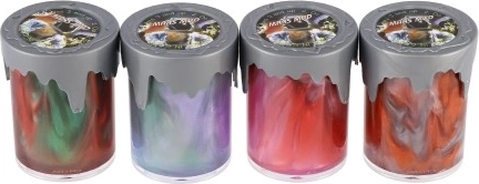 A Mars Mud fémes nyálka a gyerekeknek és a felnőtteknek egyaránt örömet okoz. Kellemes, lassan folyó állagú, amely kiválóan formázható, nyújtható és gyúrható. Az átlátszó pohár kiemeli az egyedi színörvényeket és a fémes csillogást.