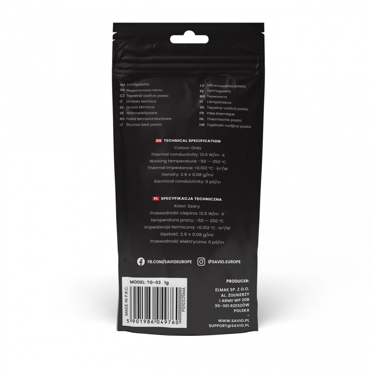 A Savio Glacier TG-03 termikus paszta a hőátadás javítására lett tervezve a processzor és a hűtő között. Konzisztenciájának köszönhetően az alkalmazása egyszerű, még kevésbé tapasztalt felhasználók számára is. A paszta kitölt minden mikroszkopikus rést a felületen, és magas hővezetőképességet biztosít.