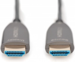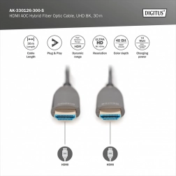 Hibrid HDMI kábel AOC lehetővé teszi a tömörítetlen kép és hang átvitelét nagy távolságokra magas adatátviteli sebességgel. Közömbösíti az elektromágneses zavarokat a hibrid szerkezet révén, amely réz és optikai szálakból áll.
