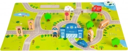 Különféle épületek és figurák segítségével a gyerekek megismerhetik a szakmákat és a városi infrastruktúrát.